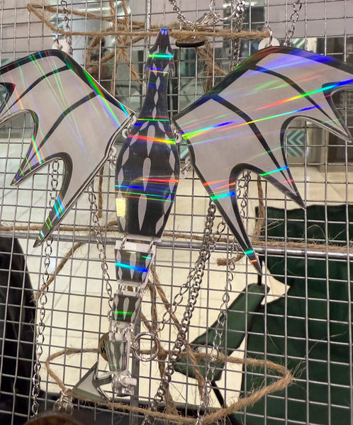 An articulated dragon, cut from iridescent or silver mirror acrylic and etched on the reverse. Hand painted in your choice of colour. Hand assembled with jump rings and attached to a 49cm (approx) silver coloured chain.